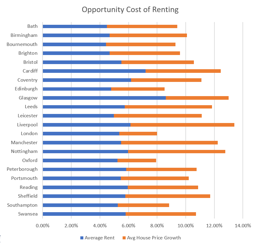 Would be house-buyers are often paying in excess of 10% by waiting to finance their home with a traditional mortgage. Liverpool, Cardiff, Nottingham and Glasgow renters are worst affected by the opportunity cost by effectively paying rates of 12%+ to rent. For many, the opportunity cost makes saving for a sufficient deposit impossible.